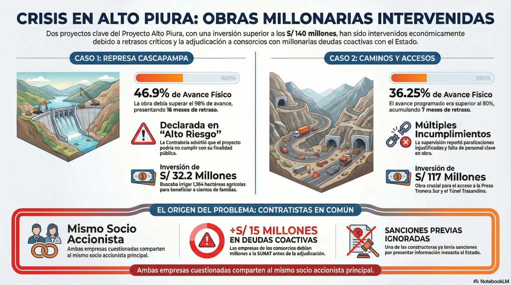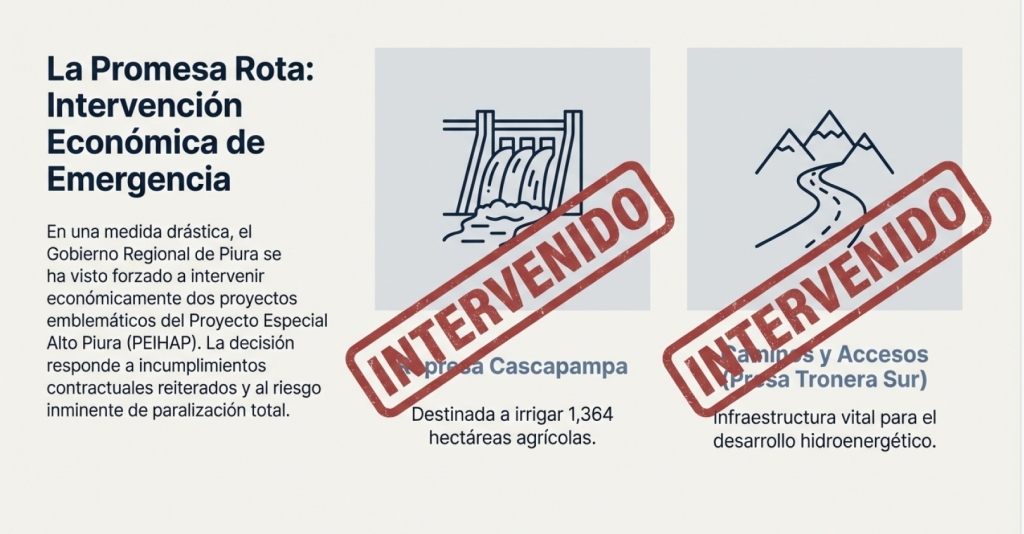 Aunque el gobernador regional de Piura, Luis Neyra, celebra la represa Cascapampa como una de sus obras emblemáticas, al igual que los caminos de accesos al componente I del Proyecto Especial de Irrigación e Hidroenergético del Alto Piura (PEIHAP), la entidad regional se ha visto obligada a intervenir económicamente ambas obras. La decisión, formalizada mediante resoluciones gerenciales, expone un patrón reiterado de incumplimientos contractuales, retrasos críticos y serios cuestionamientos a los procesos de selección y control de la inversión pública. Ambas son ejecutadas por consorcios integrados por dos empresas que arrastran millonarias deudas coactivas con el Estado.