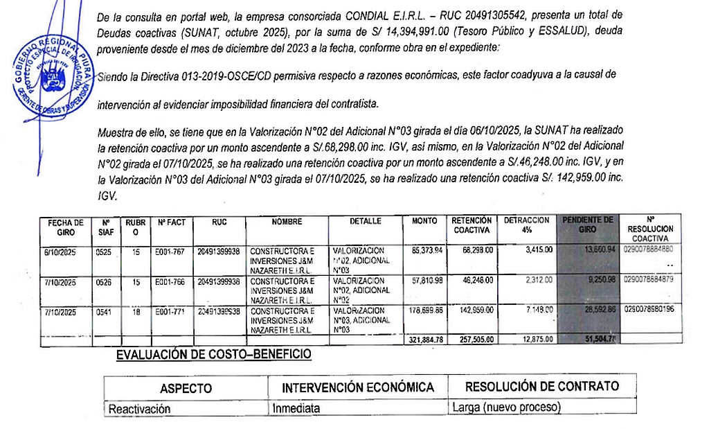 De acuerdo con la SUNAT, Constructora e Inversiones J&M Nazareth E.I.R.L. le debe al Estado S/ 1,498,453.00 por falta de pagos al Tesoro Público y Essalud. Mientras que CONDIAL E.I.R.L. tiene deudas coactivas por S/ 14,394,991.00. Solo en el caso de Nazareth, la SUNAT ya ha efectuado retenciones coactivas por más de S/ 257 mil sobre valorizaciones de obra. Estas obligaciones tributarias eran públicas y verificables antes de la adjudicación de los contratos, lo que abre serias dudas sobre la debida diligencia aplicada por el PEIHAP durante los procesos de selección.