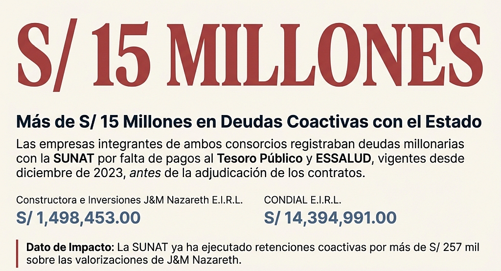 El denominador común en ambos proyectos es alarmante. Las empresas Constructora e Inversiones J&M Nazareth E.I.R.L. y CONDIAL E.I.R.L., integrantes de los consorcios ejecutores, registran deudas coactivas con la SUNAT que superan los S/ 15 millones, vigentes desde diciembre de 2023.