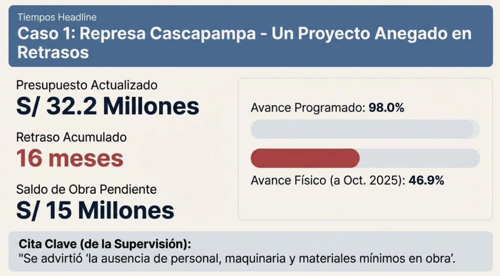 No obstante, al cierre de octubre de 2025, el avance físico acumulado apenas alcanza el 46.9%, cuando debió superar el 98%. El retraso fue advertido por el Consorcio Supervisión Cascapampa, que alertó sobre la ausencia de personal, maquinaria y materiales mínimos en obra.