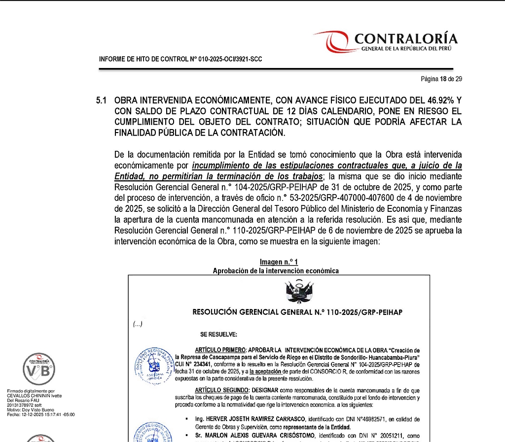 El panorama se agrava con el Informe de Hito de Control N.° 010-2025-OCI/3921-SCC de la Contraloría General de la República, publicado en diciembre del 2025. El órgano de control concluyó que la Represa Cascapampa se encuentra en “alto riesgo” de no cumplir su finalidad pública.
