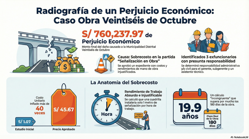 Un informe de control específico emitido por la Contraloría General de la República del Perú ha revelado un significativo perjuicio económico de S/ 760.237,97 a la Municipalidad Distrital Veintiséis de Octubre. La irregularidad se relaciona con la aprobación de un expediente técnico reformulado para la obra “Creación del servicio de movilidad urbana en las vías locales del A.H. La Península en el Centro Poblado de San Martín”, el cual presentaba una sobrevaloración en la cantidad de horas hombre y un rendimiento injustificado en la partida de señalización.