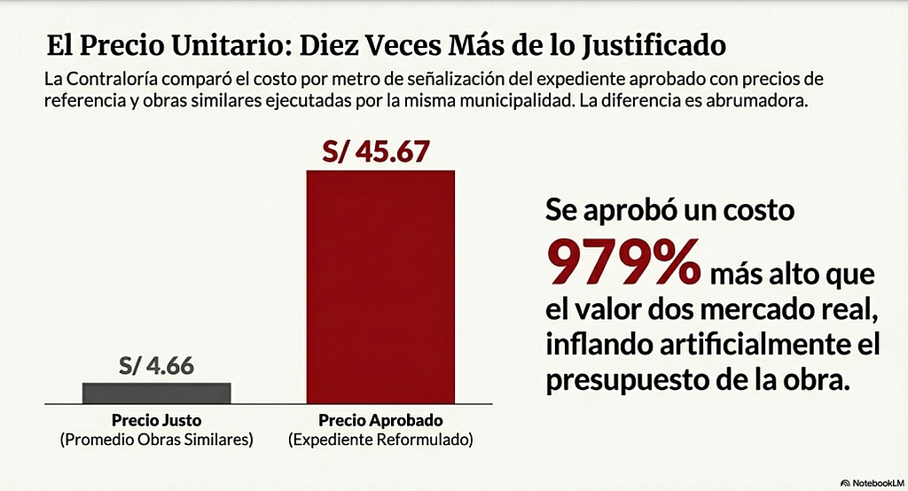 Posteriormente, el 2 de agosto de 2024, se aprobó una actualización de costos del expediente técnico, también por Felipe Iván Sánchez Cumbicus. Aunque el precio unitario de la partida de señalización se redujo en aproximadamente un 49,20% (de S/ 88,91 a S/ 45,67), la Contraloría concluyó que el recurso de mano de obra seguía incidiendo «excesivamente» debido a un rendimiento «muy bajo» e «injustificable».