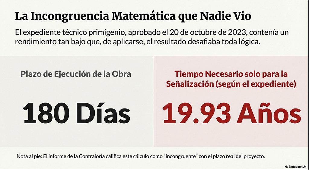 El informe detalla que el expediente técnico primigenio, aprobado el 20 de octubre de 2023 por el gerente de Desarrollo Urbano, Felipe Iván Sánchez Cumbicus, ya presentaba un rendimiento incongruente. Para la misma partida, se estimaba que la cuadrilla ejecutaría dos metros de señalización en ocho horas, lo que resultaría en 7.273,18 días de trabajo para el peón, equivalente a 19,93 años, un tiempo “incongruente” con el plazo de ejecución de 180 días calendario de la obra.