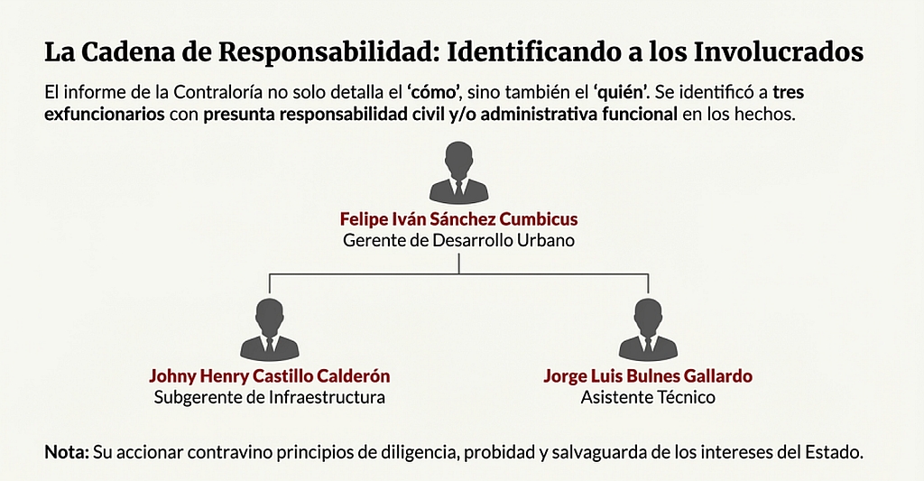1. Felipe Iván Sánchez Cumbicus, gerente de Desarrollo Urbano de la gestión de Víctor Hugo Febre, desde el 2 de agosto de 2023. Se le atribuye presunta responsabilidad administrativa funcional no sujeta a la potestad sancionadora de la Contraloría y presunta responsabilidad civil. Su accionar indebido se manifiesta en la emisión de las Resoluciones de Gerencia de Desarrollo Urbano n.° 0202-2024-MDVO/GDU (2 de agosto de 2024) y n.° 0256-2024-MDVO/GDU (6 de noviembre de 2024), mediante las cuales aprobó la actualización y reformulación del expediente técnico sin advertir el uso de un rendimiento injustificado en la partida de señalización. Esto contraviene sus funciones de gestionar el sistema de inversión y aprobar expedientes técnicos, así como principios de diligencia, salvaguarda de intereses del Estado, probidad y legalidad.