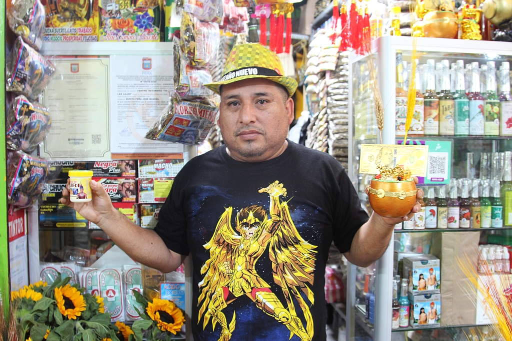 Por su parte, Santos Zurita, en el puesto 38B, complementa la oferta familiar con una selección de perfumes, colonias de florecimiento y colgadores rituales diseñados para atraer la buena fortuna. Santos es el experto en la preparación de seguros contra todo mal: son frascos pequeños que contienen hierbas de las lagunas de Las Huaringas, en Huancabamba, y los perfumes más exóticos para la abundancia.