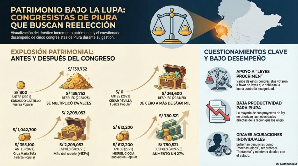 Los hallazgos muestran que los cinco congresistas por Piura que buscan continuar en el poder registraron incrementos patrimoniales sostenidos desde su llegada al Parlamento, así como aumentos significativos en sus ingresos. La información aquí expuesta busca aportar elementos verificables para el debate público y el ejercicio de un voto informado, en un contexto electoral marcado por la desconfianza ciudadana y el retorno del sistema bicameral.