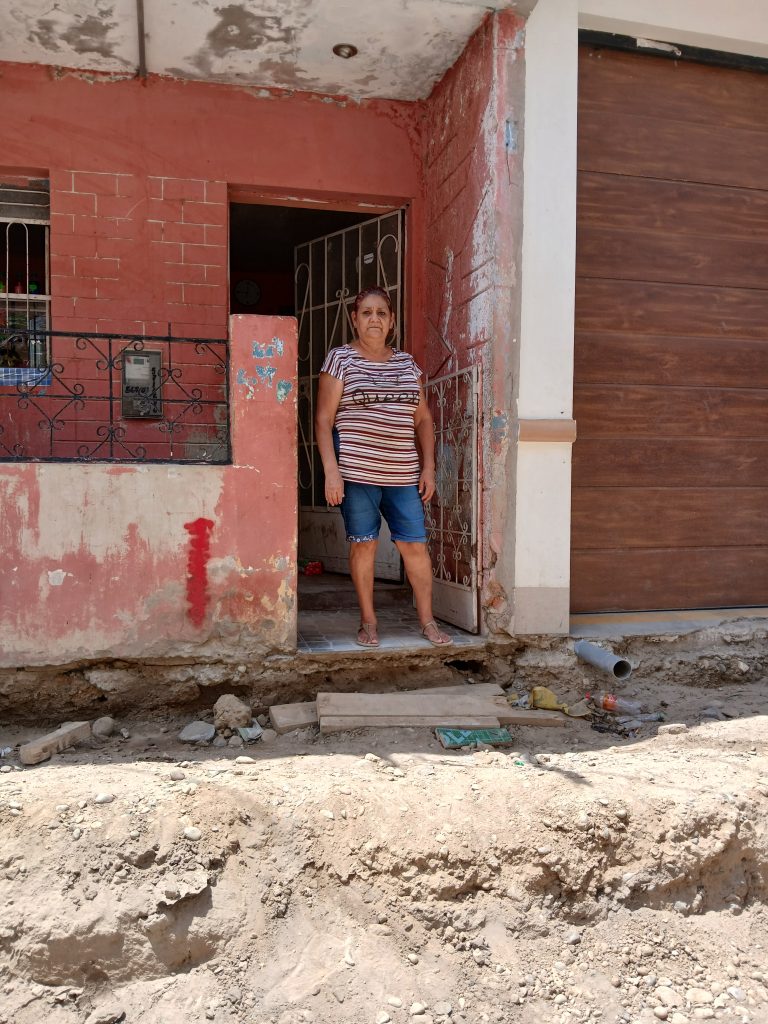Desde la entrada, Isabel Araujo Ramirez, de 63 años, observa la vía convertida en tierra y polvo. No puede bajar a la calle, sin apoyarse o ser ayudada por sus sobrinos. Se queda de pie, lo más cerca que puede, para atenderme. El suelo que pisa parece levitar, un hueco ꟷproducto de la demolición de veredasꟷ lo ha dejado suspendido.