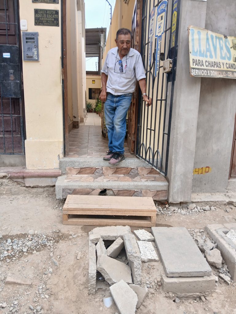 Golpea la pared y señala hacia la calle. Bajar es difícil para él. «Casi todos en la quinta hemos caído. Mira, una señora se puede caer», alza la voz. Dice que el gobierno regional se ha burlado de ellos. No dan la cara. Tampoco la municipalidad se ha acercado. Los vecinos deben reclamar para sentirse escuchados.
