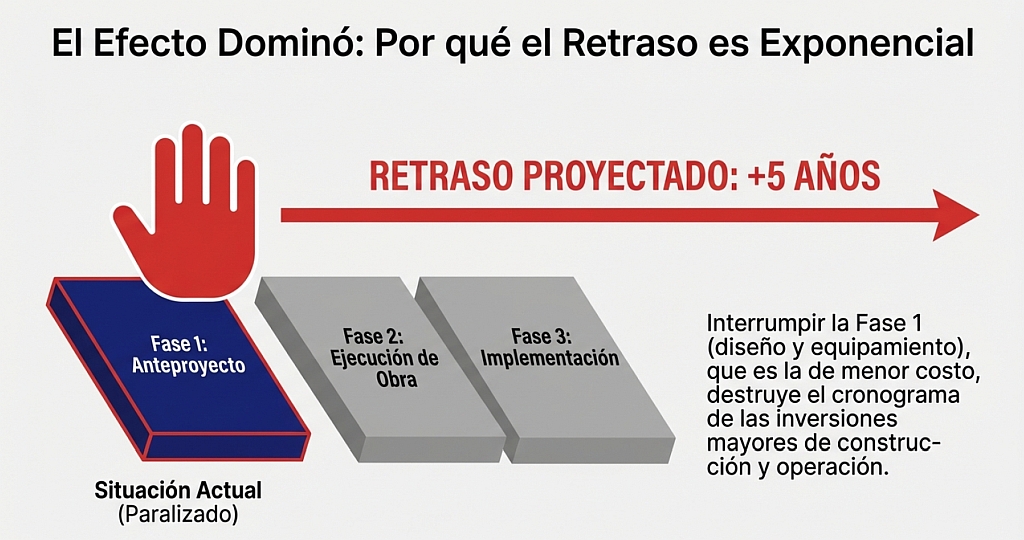 El decano explicó que los proyectos de esta envergadura constan de tres etapas: anteproyecto, ejecución de obra e implementación. Al encontrarse apenas en la primera fase —la generación del anteproyecto y diseño—, cualquier interrupción financiera impacta en cascada el cronograma total de la obra.