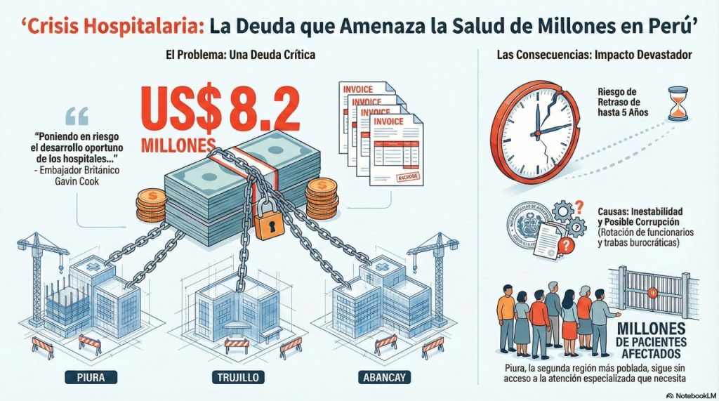El conflicto financiero se originó por el incumplimiento de pago de seis facturas vencidas correspondientes a la asistencia técnica brindada por el consorcio United Kingdom Healthcare Alliance (UKHA). Según documentos oficiales, el embajador Gavin Cook advirtió que estos retrasos están «poniendo en riesgo el desarrollo oportuno de los hospitales y afectando directamente a las tres regiones involucradas», que incluyen también a Trujillo y Abancay.