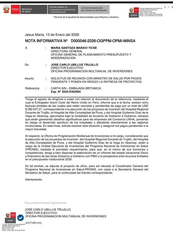Documentos oficiales y alertas diplomáticas revelan que el Ministerio de Salud (Minsa) mantiene seis facturas vencidas por un total de US$ 8,280,637.27 con el consorcio británico UKHA, encargado de la asistencia técnica para proyectos hospitalarios clave. Esta falta de pago, calificada como un «riesgo crítico» por el embajador Gavin Cook, amenaza la continuidad de los hospitales de Piura, Trujillo y Abancay en su fase inicial de diseño.