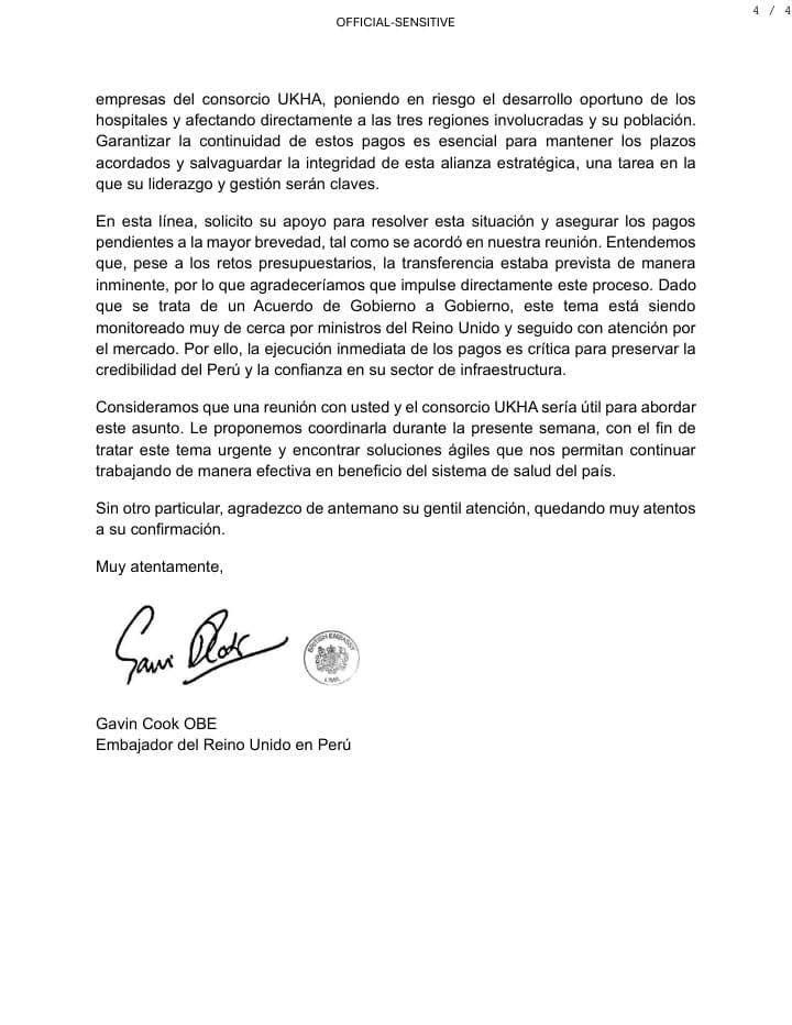 Esta deuda corresponde a la asistencia técnica brindada por el consorcio United Kingdom Healthcare Alliance (UKHA) para proyectos emblemáticos como el Hospital Regional Docente de Trujillo, el Hospital de Alta Complejidad de Piura y el Hospital Guillermo Díaz de la Vega en Abancay. Según el embajador Cook, estos retrasos no solo generan desafíos significativos para las empresas involucradas, sino que están «poniendo en riesgo el desarrollo oportuno de los hospitales y afectando directamente a las tres regiones involucradas y su población».