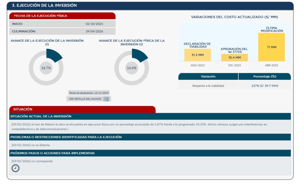 Un factor determinante en el estancamiento actual de la obra es un expediente técnico deficiente que omitió detalles críticos. Según los informes técnicos, el documento original no consideró las conexiones domiciliarias de telecomunicaciones, careciendo de planos de detalle y presupuestos para ductos de telefonía. Esta “imposibilidad técnica” forzó al Gobierno Regional de Piura a emitir una resolución de urgencia el 23 de enero de 2026 para aprobar nuevos planos que integren las redes eléctricas y de telecomunicaciones olvidadas.