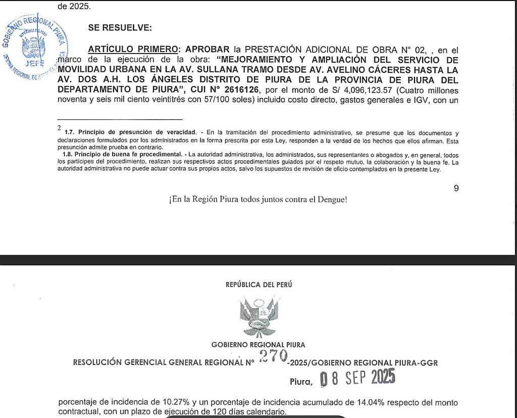 No obstante, el 8 de septiembre del 2025, mediante la resolución de gerencia general regional 270-2025, el Gobierno Regional de Piura aprobó el segundo adicional por el monto de S/ 4 millones 096 mil 123, lo que representa un porcentaje de incidencia de más del 10% respecto al monto contratado. Ambos adicionales representan un porcentaje de incidencia de casi el 15% del total contratado.