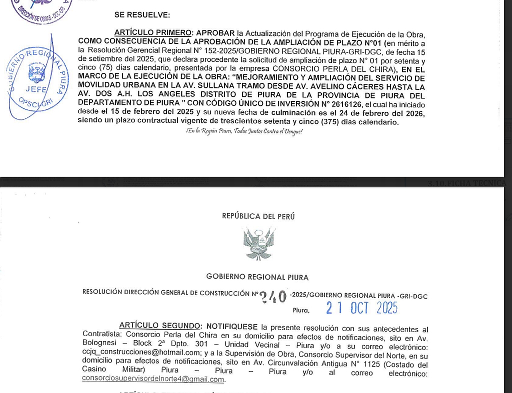 Sin embargo, el costo de la obra se ha incrementado debido a la aprobación de dos adicionales por parte del Gobierno Regional de Piura. El primero fue aprobado mediante la resolución de la Gerencia General Regional N° 233-2025 del 5 de agosto. El monto aprobado fue de 1 millón 503 mil 724 soles y representa casi un 4% del costo contractual de la obra.