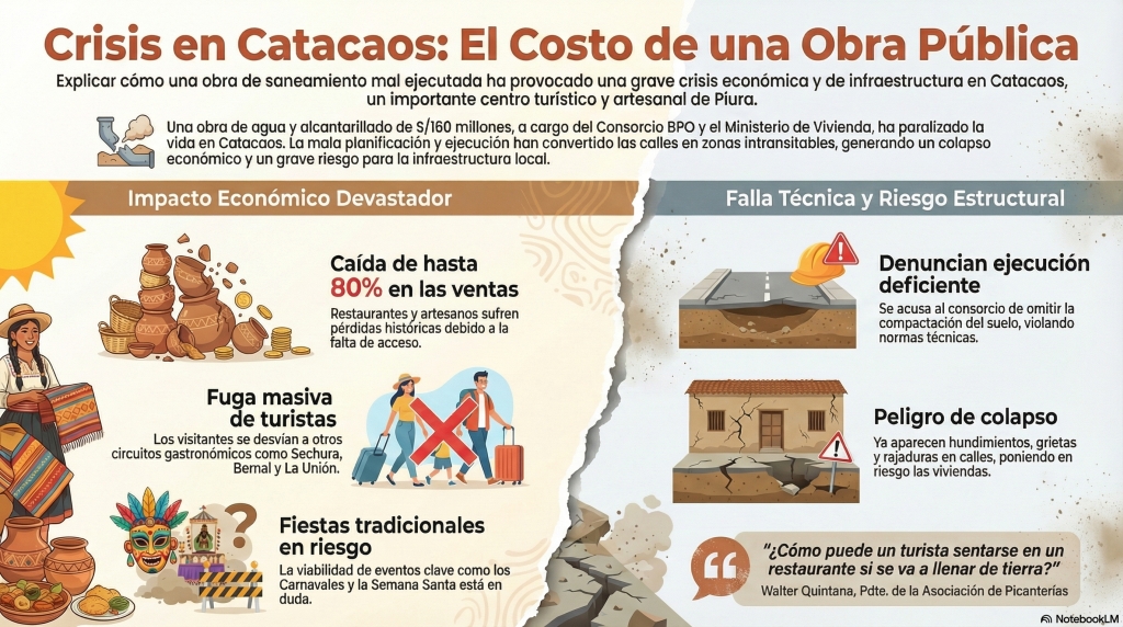 La Heroica Villa de Catacaos, históricamente reconocida como el corazón artesanal y gastronómico de la región Piura, enfrenta hoy una de las crisis económicas más severas de las últimas décadas. Lo que debía ser un hito de progreso, la ejecución del proyecto integral de agua potable y alcantarillado, se ha transformado en un obstáculo crítico para el desarrollo local. Esta obra, valorizada en más de 160 millones de soles y financiada por el Ministerio de Vivienda, Construcción y Saneamiento (MVCS), ha sumido al distrito en una situación de emergencia que trasciende lo sanitario para golpear directamente el bolsillo de miles de familias.
