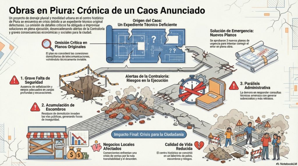Las polémicas obras de drenaje pluvial y movilidad urbana en el Centro Histórico de Piura continúan causando impactos negativos en los negocios locales, pero también presentan riesgos alertados recientemente por la Contraloría de la República. El origen de todo es un expediente técnico defectuoso que ha obligado al Gobierno Regional de Piura aprobar nuevos planos para redes de telecomunicaciones.