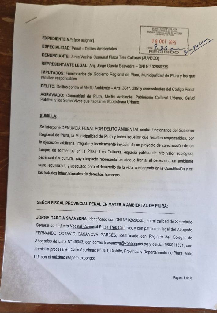 Una denuncia penal por Delitos Ambientales fue interpuesta hace unos días ante la Fiscalía Provincial Penal en Materia Ambiental de Piura contra funcionarios del Gobierno Regional de Piura, la Municipalidad de Piura y todos aquellos que resulten responsables. La acusación, presentada por la Junta Vecinal Comunal Plaza Tres Culturas (JUVECCO) el 9 de octubre de 2025, busca la paralización inmediata y la investigación de la ejecución del proyecto de un «tanque de tormentas» en la emblemática Plaza Tres Culturas.