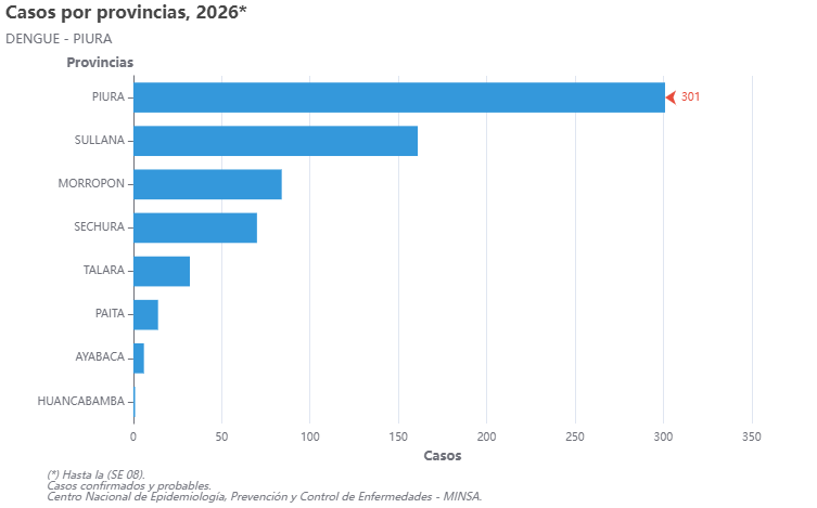 A nivel provincial, Piura concentra el mayor número de casos con 301, seguida de Sullana con 161, Morropón con 84, Sechura con 70, Talara con 32, Paita con 14, Ayabaca con 6 y Huancabamba con 1 caso.