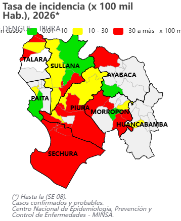 Sin embargo, cuando se analiza la tasa de incidencia por cada 100 mil habitantes, el impacto de la enfermedad cambia. Sechura registra la mayor incidencia con 73 casos por cada 100 mil habitantes, seguida de Morropón con 49, Sullana con 42 y Piura con 31.