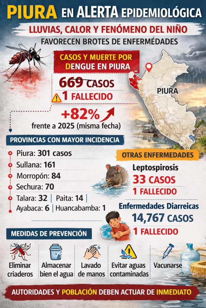 Las lluvias estacionales, el intenso calor y la fase inicial de un Fenómeno del Niño están configurando un escenario epidemiológico complejo en Piura. Las condiciones climáticas favorecen la proliferación de mosquitos transmisores del dengue, el contacto con aguas contaminadas y la descomposición más rápida de alimentos, factores que incrementan la presencia de enfermedades infecciosas en la región.