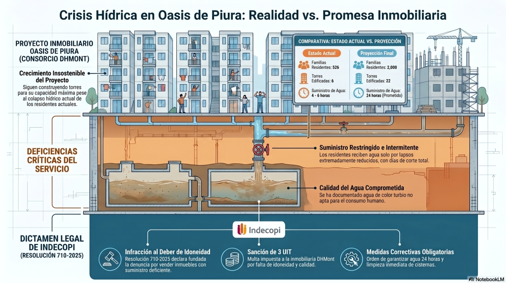 Mediante la resolución 710-2025, Indecopi Piura declaró fundada la denuncia de los vecinos contra la inmobiliaria DH Mont por haber vendido inmuebles con deficiencias en el suministro de agua potable «debido a que era brindado de 4 a 6 horas diarias, incluso habiendo días donde era inexistente». Además, la resolución señala que «el agua poseería un color turbio».